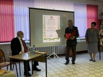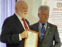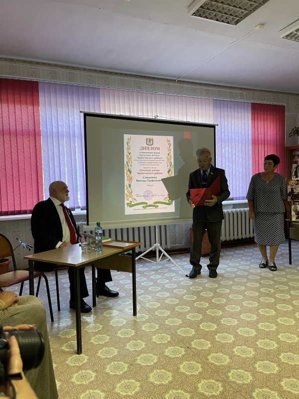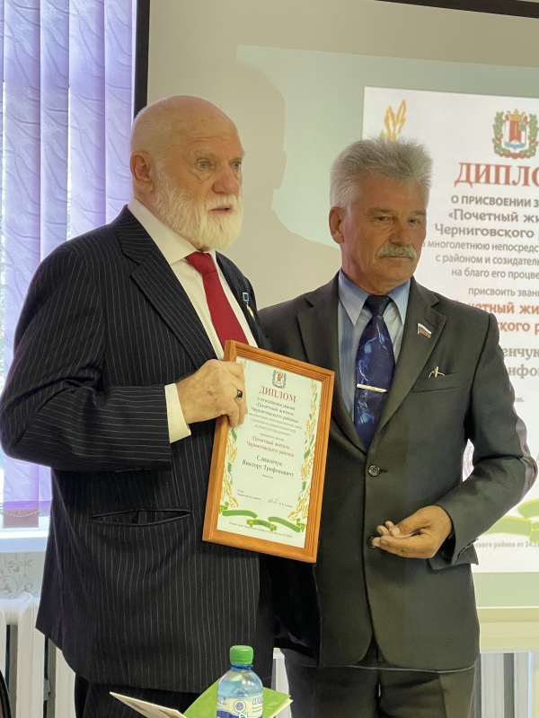 Г.А. Никитин вручает В.Т. Слипенчуку диплом "Почётный гражданин Черниговского района"