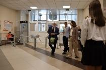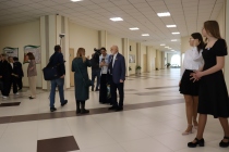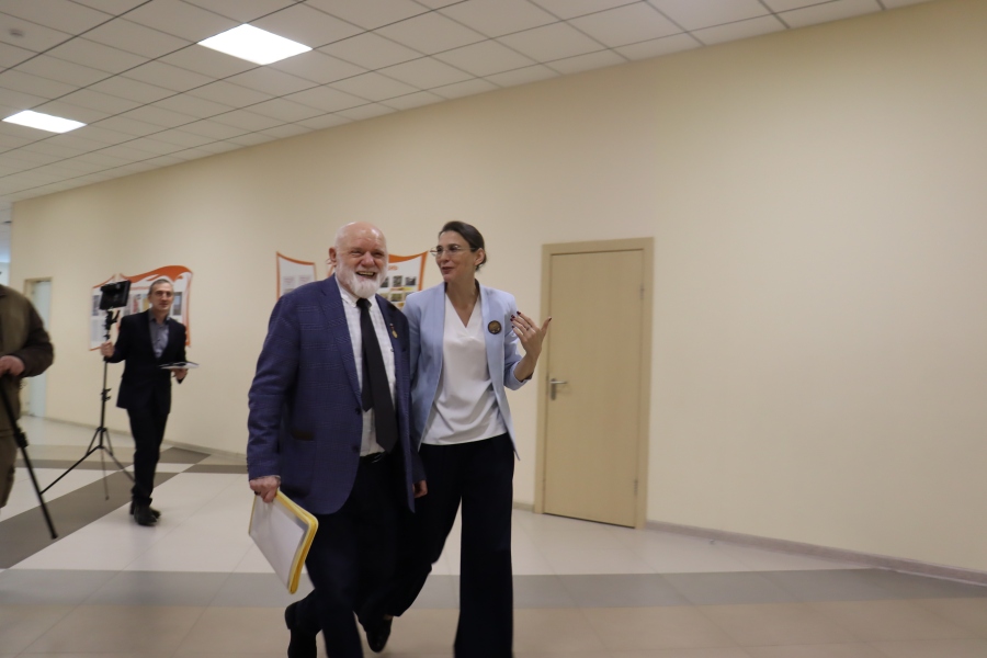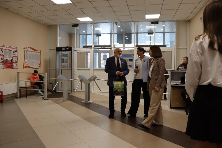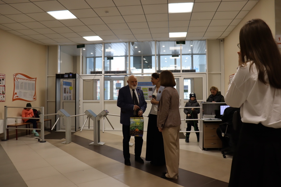 Маргарита Николаевна Спиричева (учитель технологии) и Екатерина Геннадьевна Иванова (руководитель школьного методического объединения учителей русского языка и литературы) встречают писателя Виктора Слипенчука